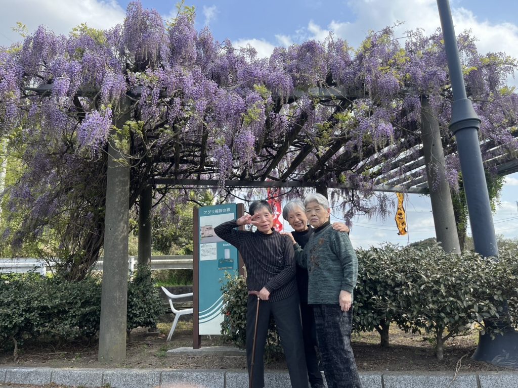 2025年4月17日 / 最終更新日 : 2025年4月30日 GH星ヶ丘 季節のイベント 満開の藤を見に行きました♪ 希望した方々と、次回外出予定の下見にドライブに行きました(^^) 満開の藤の花と桜に皆さんの笑顔も満開♪ ツツジの満開までは、まだ少し余裕がありそうでした(^。^)